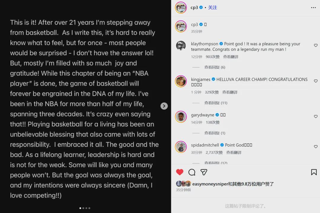 北京时间2月14日凌晨,克里斯-保罗更新个人社交媒体,宣布正式从NBA退役,结束21年的职业生涯。本赛季交易截止日,保罗被快船交易到猛龙,今天凌晨被猛龙裁掉。他没有继续寻找下家,而是头也不回地离开了这个联盟。