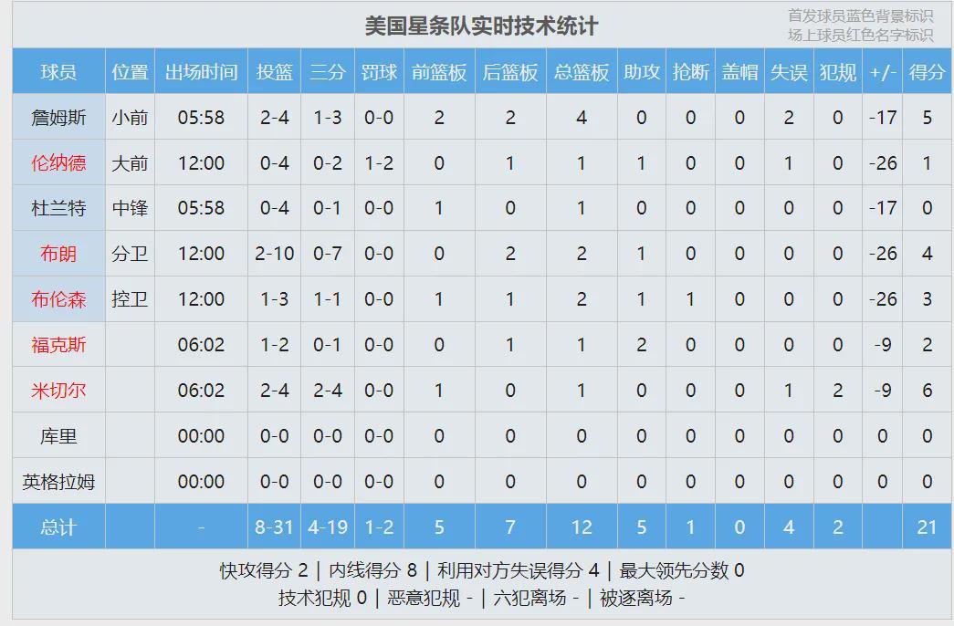 条纹队和星辰队会师决赛,条纹队老将的体力下降,前10次出手全部打铁。星辰队开局打出12-1领先到两位数。詹姆斯连得5分,爱德华兹连砍8分回应。打了半节,星辰队领先到17分。条纹队派上五小阵容,依然无法迫近分差。