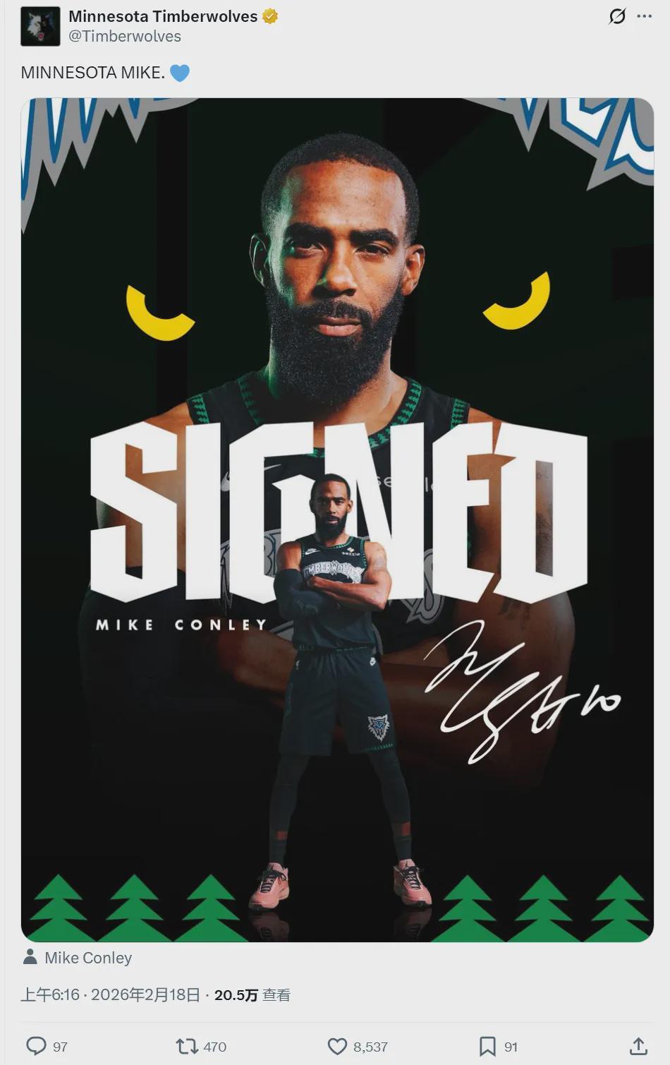 北京时间2月18日上午6点,明尼苏达森林狼队官方宣布:球队正式签回38岁老将迈克-康利。这是一份老将底薪合同,双方签约至本赛季结束。康利原有合同2年2100万美元,今年夏天到期。此前他被黄蜂裁掉,恢复了自由身。