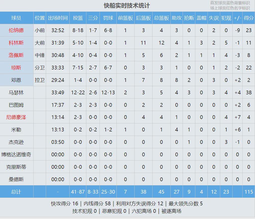 快船能够获胜,马瑟林居功至伟。此役他替补出战34分钟,投篮22中12,三分6中2,罚球13中12,爆砍38分5篮板4助攻3抢断,得分追平个人生涯纪录。快船队史上仅有两名球员替补出战时比马瑟林得分更高:路威和鲍伯-麦卡杜。
