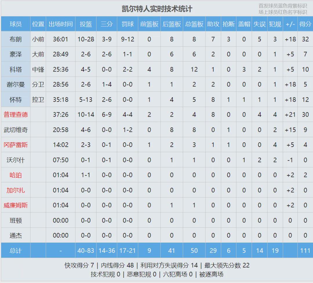 凯尔特人替补合砍45分,普理查德独得30分4篮板8助攻,湖人替补加起来25分!杰伦-布朗28投10中,砍下32分8板7助3断,他跟普理查德合砍62分。湖人东契奇25分5板3助、詹姆斯20分4板5助2断、里夫斯15分7板2助2断。