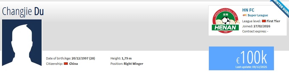 德转更新,杜长杰自由身回归河南队,球员上赛季效力于上海嘉定汇龙(宁波)。