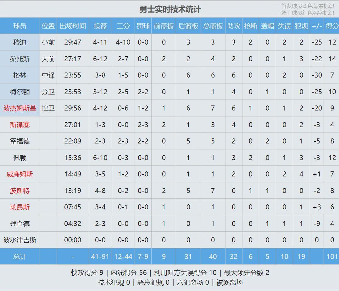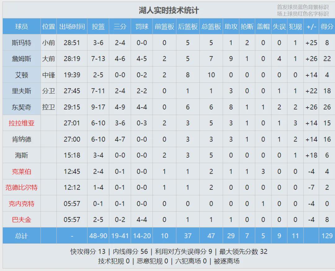 詹姆斯火力全开,第二节6投5中单节轰下14分。上半场詹姆斯10投7中,砍下20分4板4助1断,正负值+20。湖人全队三分球17中9,勇士只有24中5。小佩顿8投5中砍下10分,得分全队最高。追梦3中1怒砍2分,正负值-20两队最低。