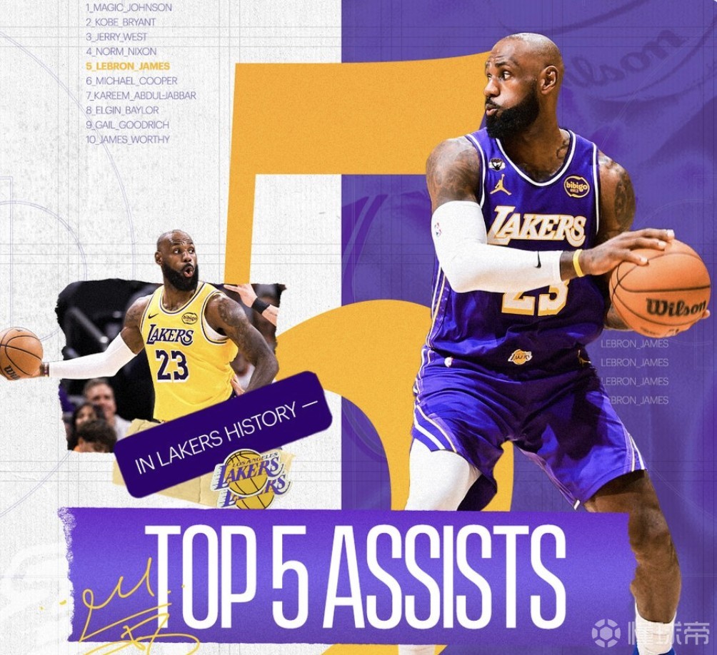 比赛进行到第二节,随着詹姆斯送出的一次助攻,他的湖人生涯助攻总数来到3667次,超越球队名宿迈克尔-库珀升至队史第五位。