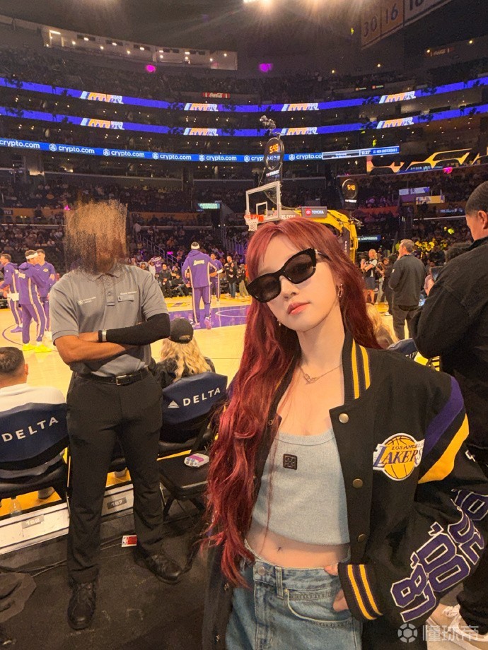 此外,宋雨琦还穿上了湖人队的应援外套,戴上墨镜,十分帅气。