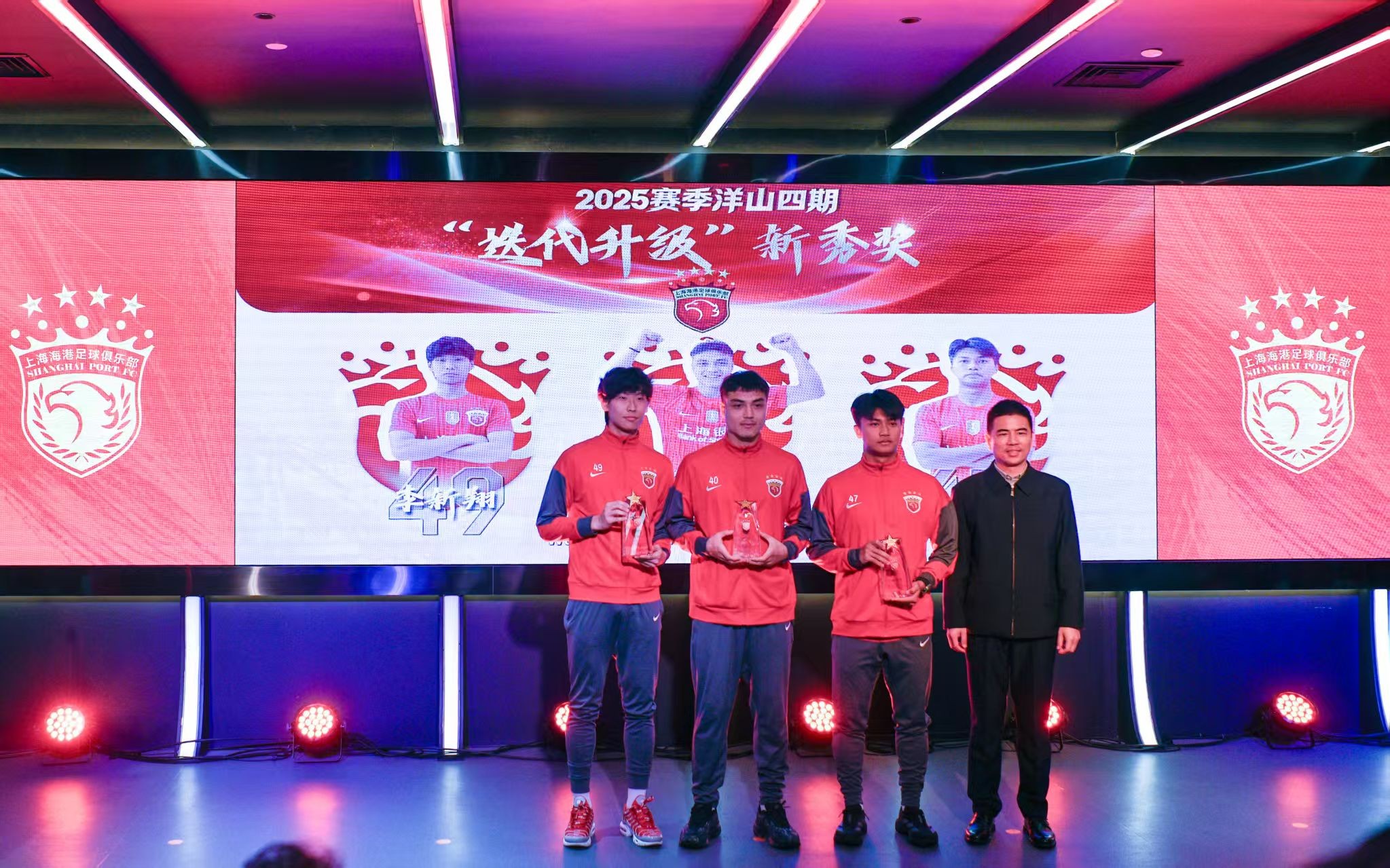 上港集团全国劳模黄华为吾米提江、李新翔、蒯纪闻颁发“迭代升级”新秀奖,上海市足协主席柳海光为主教练穆斯卡特颁发“运筹帷幄”ITOS奖。