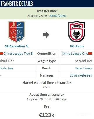 德转显示,陕西联合花费约100万人民币从广州蒲公英签下郭五岳。