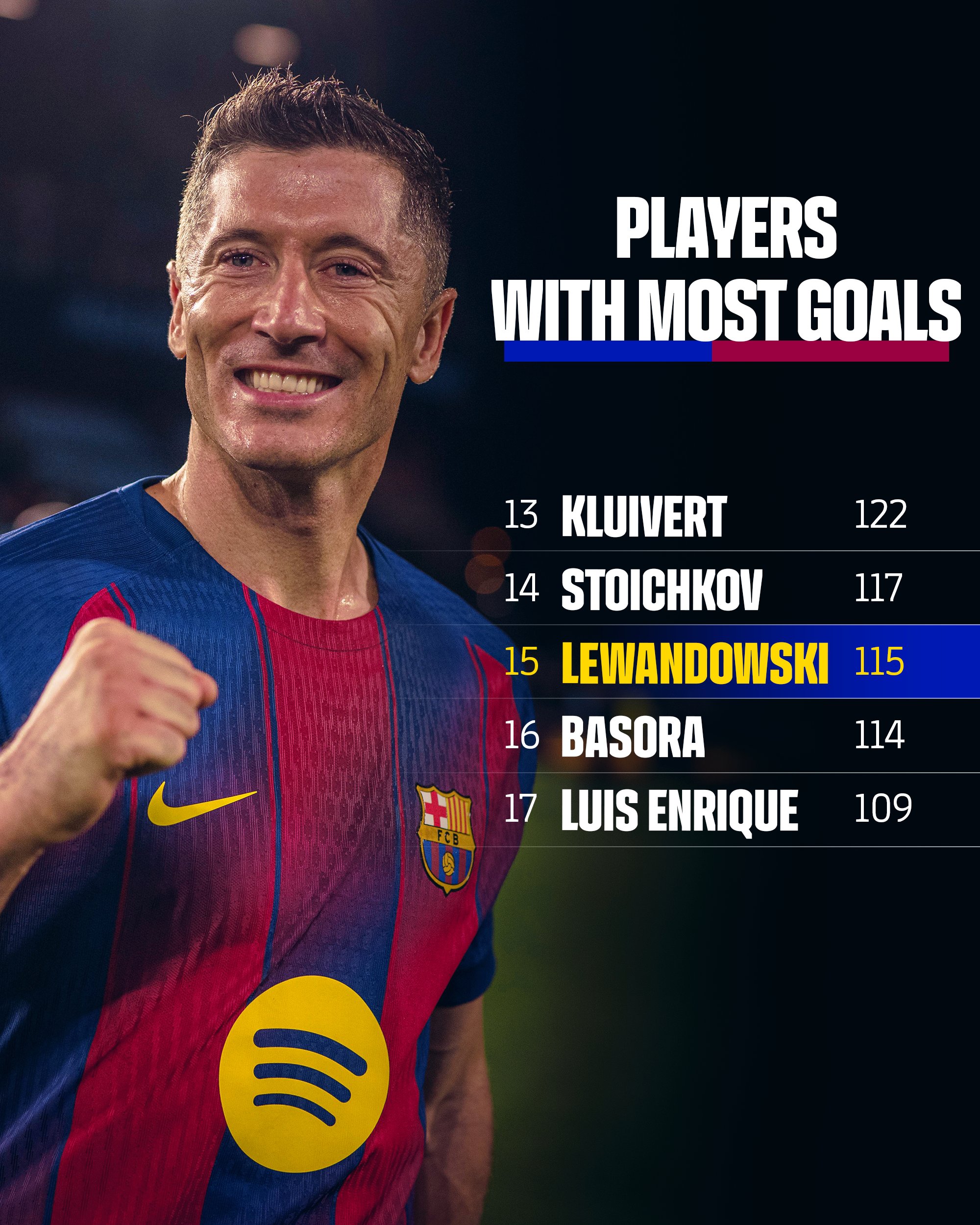 莱万已经为巴萨打进115球,据俱乐部官方统计,他已经超越了巴索拉,独占队史射手榜第15名。而莱万距离前一名斯托伊奇科夫还有2球的差距。