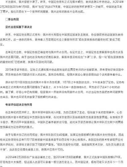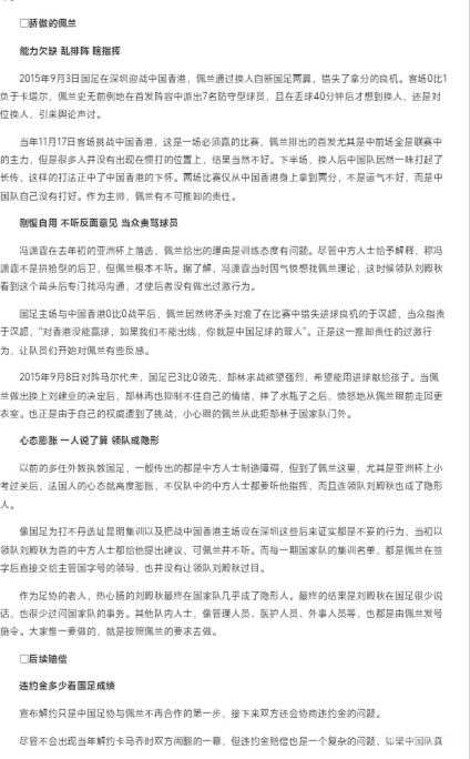 此外笔者在翻越当年的新闻报道时找到了这样一篇关于佩兰下课始末的记载,关于佩兰的下课,彼时的专家组评判起到了决定性作用:由于提前解约需要赔付解约金,因此在两平香港后的第一时间佩兰并没有下课,但专家组的意见在后续的选择却起到了决定性作用,专家组认为亚洲杯结束后佩兰不再把中方教练组放在眼里,我行我素固执己见,并在组队方面存在问题、佩兰临场指挥欠缺必要能力,与队员沟通交流不足,于是足协才下定决心解约佩兰。关于该细节笔者直接放到下面供大家阅览。