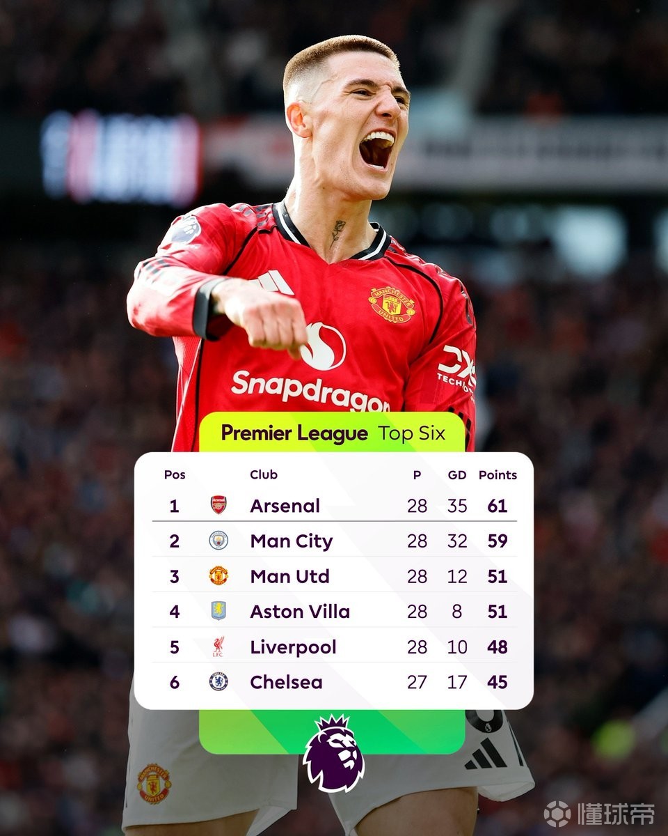 英超第28轮,曼联主场2-1击败水晶宫,此役过后,曼联升至英超第三名,这是曼联自2023年5月以来首次在周末结束时排名英超第三。