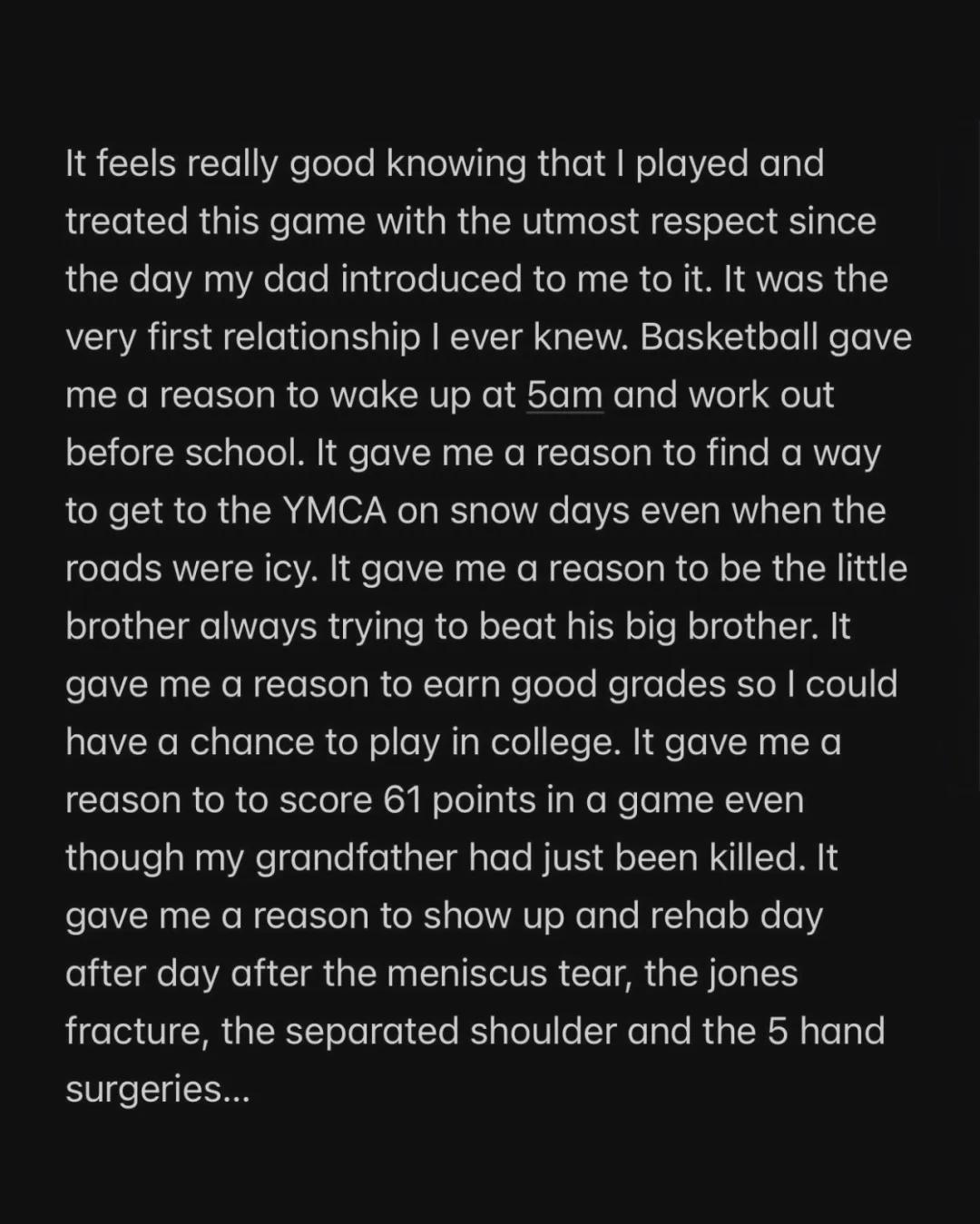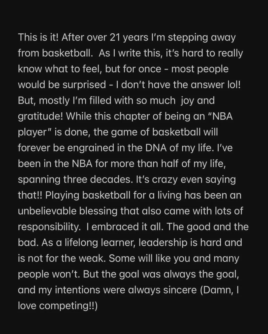 作为"NBA球员"的这一篇章已经结束,但篮球这项运动,早已刻进我的DNA,永远不会离开我。