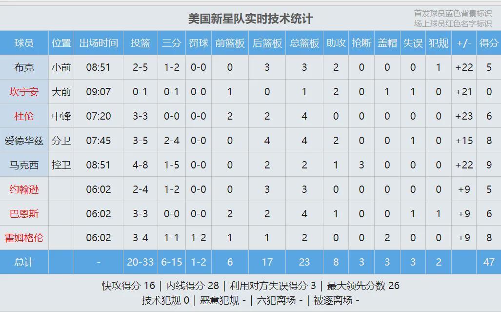 条纹队和星辰队会师决赛,条纹队老将的体力下降,前10次出手全部打铁。星辰队开局打出12-1领先到两位数。詹姆斯连得5分,爱德华兹连砍8分回应。打了半节,星辰队领先到17分。条纹队派上五小阵容,依然无法迫近分差。