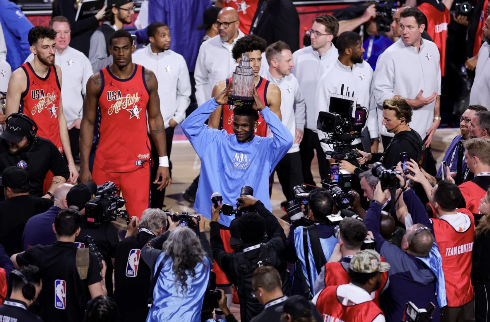 初步统计结果显示,2026年全明星赛的收视率比2025年全明星赛高出87%。收视高峰出现在美国东部时间晚上7点至7点15分,当时美国队以48比45战胜世界队。