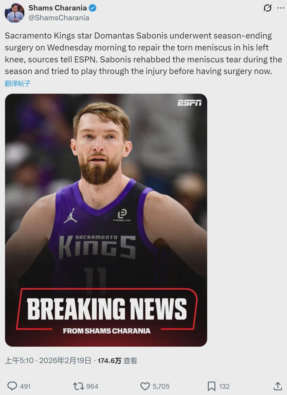 北京时间2月19日上午,NBA名记Shams报道,萨克拉门托国王队内线多曼塔斯-萨博尼斯接受左膝半月板撕裂修复手术,本赛季报销!小萨本赛季一直接受半月板撕裂的康复治疗,并尝试带伤出战,但最终他还是选择了手术。