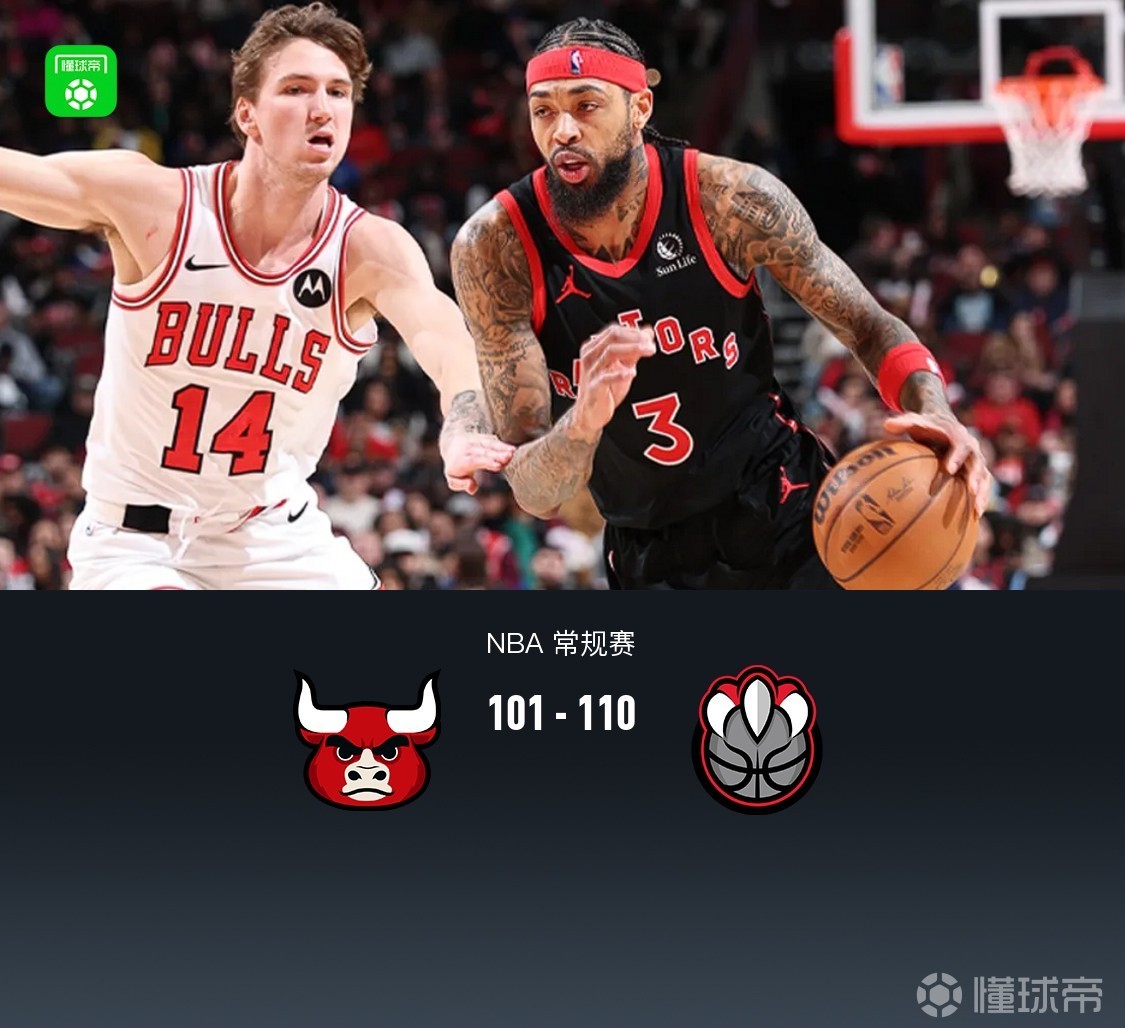 第四节公牛亚布塞莱拿下6分,猛龙默里-博伊尔斯拿下5分,最终公牛101-110不敌猛龙