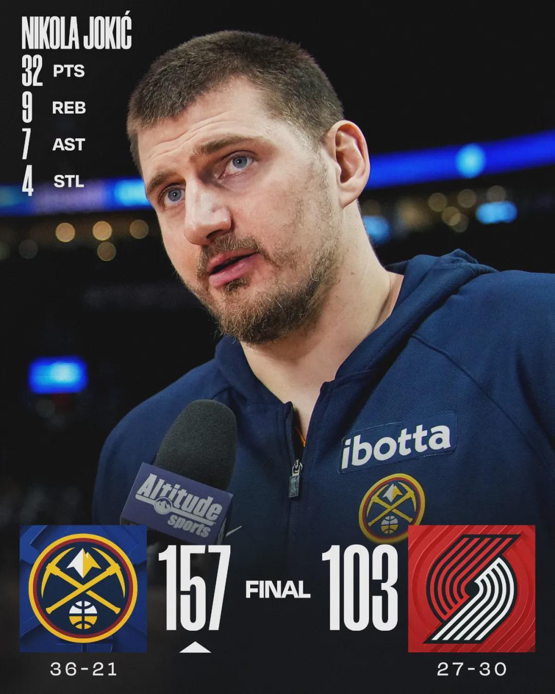 掘金36胜21负重返西部第3,领先火箭0.5个胜场。开拓者27胜30负仍居西部第10,依然落后快船0.5个胜场。开拓者核心阿夫迪亚赛后表示:“掘金昨天输了,今天他们想证明一些东西。这就是NBA运作方式,没什么大惊小怪的。”