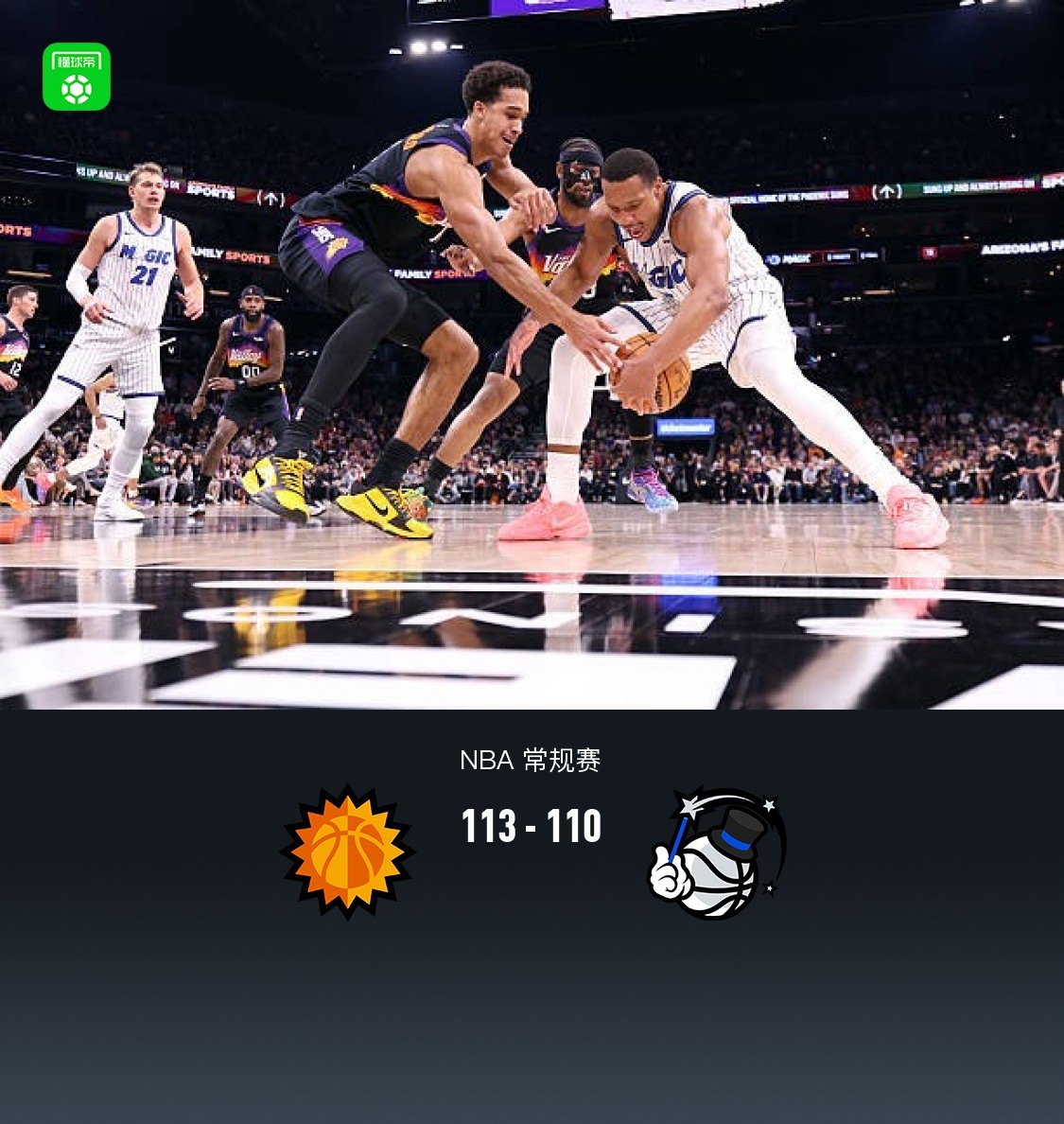 北京时间2月22日NBA 常规赛,菲尼克斯太阳对阵奥兰多魔术。半场太阳43-51魔术,最终,杰伦-格林压哨三分绝杀,拒绝三加时,太阳113-110魔术。