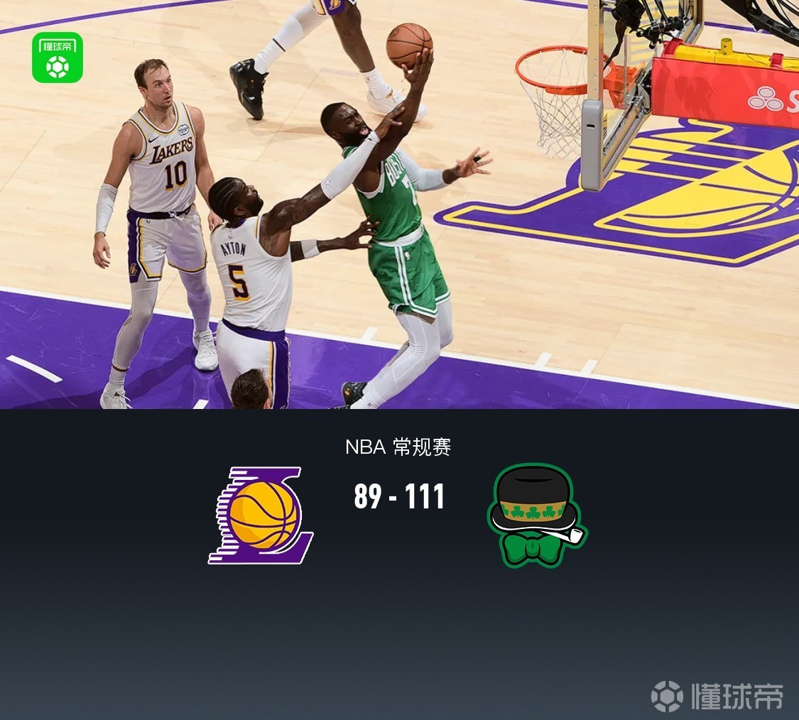 第四节,开节湖人詹姆斯、里夫斯领衔得分,但凯尔特人普里查德连攻带传继续保持两位数领先,拉锯之后,来到后半节湖人再度哑火,凯尔特人普里查德、布朗联手迅速将分差拉大至20分,比赛最后3分多钟湖人缴械投降换下主力,最终湖人89-111不敌凯尔特人。