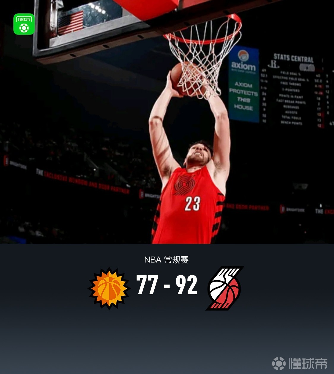 波特兰开拓者格兰特23分2板1助1断1帽,克林根23分12板3助1断4帽,卡马拉12分11板2助1断1帽。