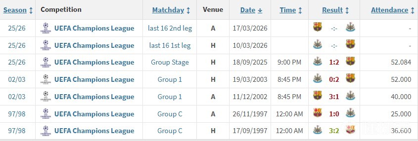 02-03双方再次在小组赛相遇,巴萨主场3-1、客场2-0双杀了纽卡,巴萨最终小组头名出线,纽卡则小组第三出局,不过巴萨在8强中两回合2-3遭到尤文淘汰。