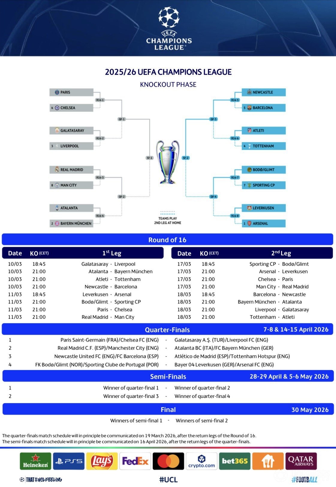 欧冠1/8决赛比赛时间(北京时间)
