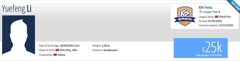 李岳峰现年23岁,司职门将,在2022赛季加盟天津津门虎,目前共为球队出场2次,均完成零封。现在他在德转上的身价为2.5万欧。