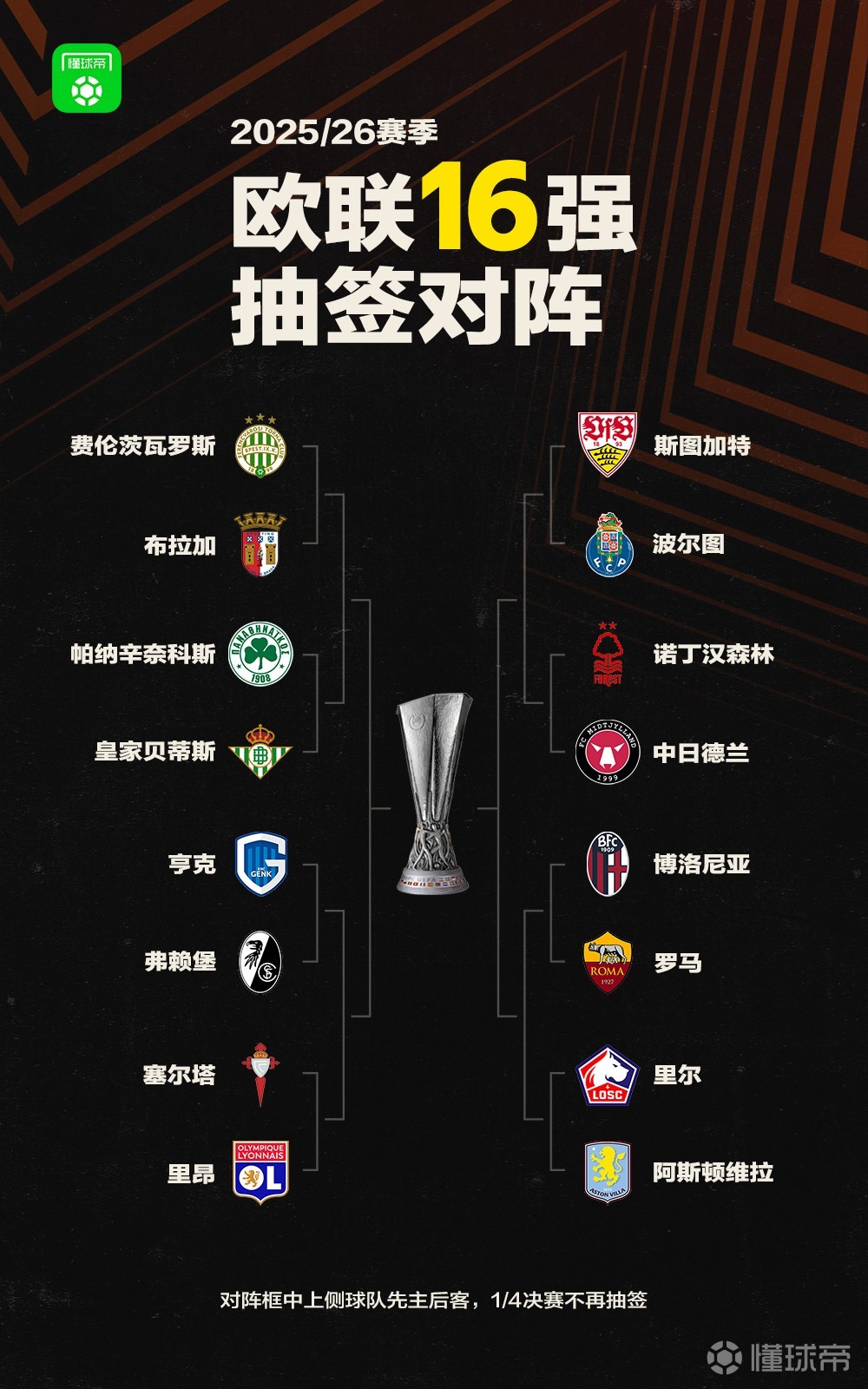 北京时间2月27日,2025/26赛季欧联淘汰赛抽签仪式在瑞士尼翁的欧足联总部进行,在16强中,维拉将迎战里尔,罗马与博洛尼亚进行同国内战。